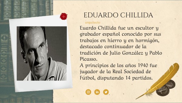 Euardo Chillida fue un escultor y grabador español conocido por sus trabajos en hierro y en hormigón, destacado continuador de la tradición de Julio González y Pablo Picasso. A principios de los años 1940 fue jugador de la Real Sociedad de Fútbol, disputando 14 partidos.