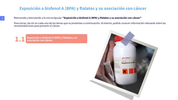 Bienvenida y bienvenido a la microcápsula: "Exposición a bisfenol A (BPA) y ftalatos y su asociación con cáncer" Para iniciar, da clic en cada uno de los temas que se presentan a continuación. Al interior, podrás conocer información relevante sobre las recomendaciones para prevenir el cáncer.