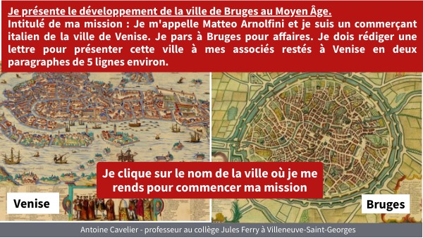 Bilan : Je m'appelle Matteo Arnolfini et je suis un commerçant italien de la ville de Venise. Je pars à Bruges pour affaires. Je dois rédiger une lettre pour présenter cette ville à mes associés restés à Venise en deux paragraphes de 5 lignes environ.