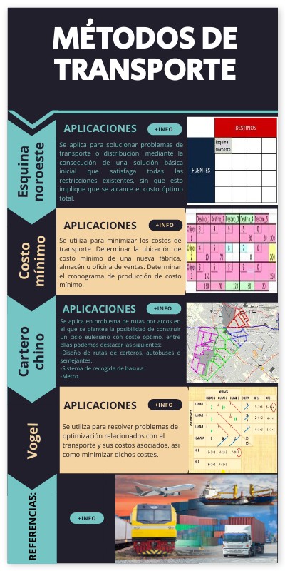 Se utiliza para resolver problemas de optimización relacionados con el transporte y sus costos asociados, asi como minimizar dichos costes.