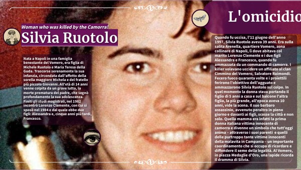 Quando fu uccisa, l'11 giugno dell'anno 1997, Silvia Ruotolo aveva 39 anni. Era sulla salita Arenella, quartiere Vomero, zona collinare di Napoli, lì dove abitava col marito e i due figli , quando fu ammazzata da un commando di camorra. I killer volevano uccidere un affiliato al clan Cimmino del Vomero, Salvatore Raimondi. Fecero fuoco quaranta volte e i proiettili ferirono l'obiettivo dell'agguato e ammazzarono Silvia Ruotolo sul colpo. In quel momento la donna stava portando il figlio di 5 anni a casa e sul balcone l'altra figlia, la più grande, all'epoca aveva 10 anni, vide la scena. Il suo barbaro assassinio, avvenuto peraltro in pieno giorno e davanti ai figli, scosse la città e non solo. Quella mamma era infatti la prima donna italiana vittima innocente di camorra e divenne un simbolo che tutt'oggi anima – attraverso i suoi parenti e quelli delle purtroppo tante vittime innocenti della malavita in Campania – un importante coordinamento che si occupa di ricordare e diffondere il seme della legalità. Al Vomero, in piazza Medaglie d'Oro, una lapide ricorda il dramma di Silvia.