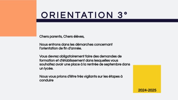 Chers parents, Chers élèves, Nous entrons dans les démarches concernant l’orientation de fin d’année. Vous devrez obligatoirement faire des demandes de formation et d’établissement dans lesquelles vous souhaitez avoir une place à la rentrée de septembre dans un lycée. Nous vous prions d’être très vigilants sur les étapes à conduire