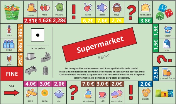 Sei la regina/il re del supermercato? La maga/il druido delle corsie? Testa la tua indipendenza economica e completa la spesa prima dei tuoi amici! Clicca sul dado, muovi la tua pedina sulla casella su cui devi andare e rispondi correttamente alle domande per potere procedere.