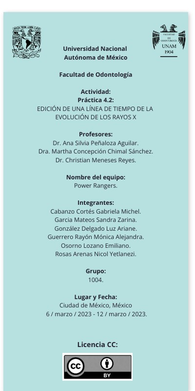 Universidad Nacional Autónoma de México Facultad de Odontología Actividad: Práctica 4.2: EDICIÓN DE UNA LÍNEA DE TIEMPO DE LA EVOLUCIÓN DE LOS RAYOS X Profesores: Dr. Ana Silvia Peñaloza Aguilar. Dra. Martha Concepción Chimal Sánchez. Dr. Christian Meneses Reyes. Nombre del equipo: Power Rangers. Integrantes: Cabanzo Cortés Gabriela Michel. Garcia Mateos Sandra Zarina. González Delgado Luz Ariane. Guerrero Rayón Mónica Alejandra. Osorno Lozano Emiliano. Rosas Arenas Nicol Yetlanezi. Grupo: 1004. Lugar y Fecha: Ciudad de México, México 6 / marzo / 2023 - 12 / marzo / 2023.