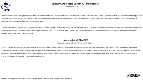 From https://breakingnewsenglish.com/2302/230213-chatgpt-chatbot-4.html and Vocable magazine (n°883, March 2023)