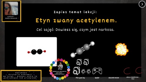 1. Przypomnienie z alkinach i wstęp o etynie - projekcja filmiku w biteable.Uczniowie przygotowują swoją mapę myśli. 2. Quiz w genial.ly - Jak zapisać wzór alkinu o znanej liczbie atomów węgla w cząsteczce? 3. Wizytówka etynu - acetylenu - wiadomosci ogólne. 4. Otrzymywanie etynu - działanie karbidem na wodę i badanie palności. 5. Spalanie etynu. 6. Właściwości etynu. 7. Zastosowanie etynu. 8Quiz w genial.ly. 9. Zadanie rachunkowe. 10. PODSUMOWANIE - QUIZIZZ.