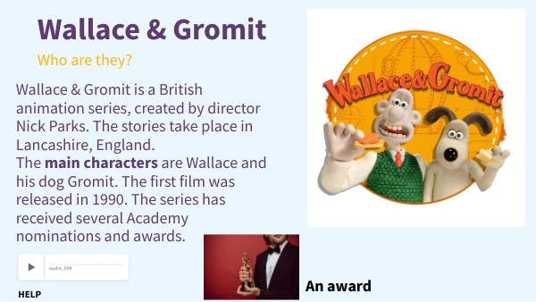 Wallace & Gromit is a British animation series, created by director Nick Parks. The stories take place in Lancashire, England. The main characters are Wallace and his dog Gromit. The first film was released in 1990. The series has received several Academy nominations and awards.