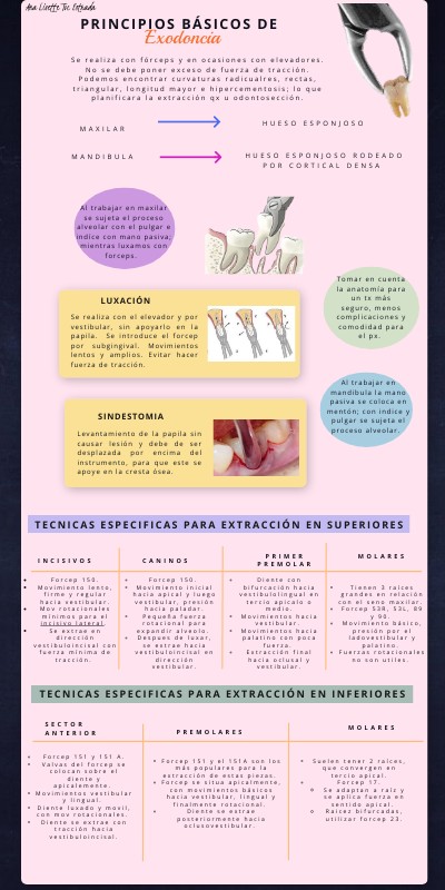 Se realiza con el elevador y por vestibular, sin apoyarlo en la papila. Se introduce el forcep por subgingival. Movimientos lentos y amplios. Evitar hacer fuerza de tracción.
