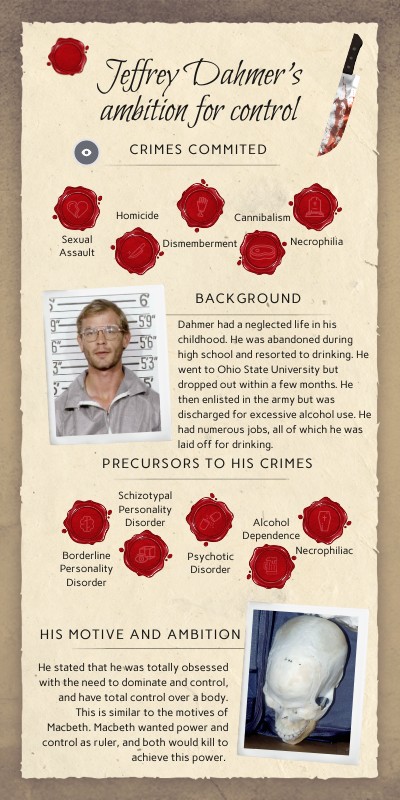 He stated that he was totally obsessed with the need to dominate and control, and have total control over a body. This is similar to the motives of Macbeth. Macbeth wanted power and control as ruler, and both would kill to achieve this power.