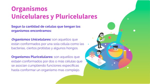 Segun la cantidad de celulas que tengan los organismos encontramos: Organismos Unicelulares: son aquellos que están conformados por una sola célula como las bacterias, ciertos protistas y algunos hongos. Organismos Pluricelulares: son aquellos que estaán conformados por dos o más células que se asocian cumpliendo funciones especificas hasta conformar un organismo mas complejo.