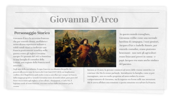 Giovanna d'Arco è stata una figura importante durante la Guerra dei Cent'anni, un conflitto durato dal 1337 al 1453 tra la Francia e l'Inghilterra. La guerra ebbe origine da una disputa sulla successione al trono francese tra Edoardo III d'Inghilterra e Filippo VI di Francia. Nel corso della guerra, gli inglesi conquistarono diverse città e territori francesi, tra cui Rouen, Calais e la Guyenna. Nel 1420, il Trattato di Troyes sancì l'ascesa al trono di Enrico V d'Inghilterra e la sua successione al trono francese, dopo la morte di Carlo VI di Francia. In questo contesto, Giovanna d'Arco, una giovane contadina francese, affermò di aver ricevuto visioni divine che le ordinarono di liberare la Francia dagli inglesi e di far incoronare Carlo VII come re di Francia.Giovanna d'Arco è diventata un'importante figura della guerra quando, a soli 17 anni, ha affermato di essere stata ispirata da voci divine a liberare la Francia dall'invasione inglese. Ha incontrato il futuro re di Francia, Carlo VII, e ha ottenuto da lui l'autorizzazione per guidare l'esercito francese. Ha combattuto in alcune importanti battaglie, tra cui quella di Orléans, che ha permesso alla Francia di ottenere una vittoria significativa contro gli inglesi. Nonostante la sua giovane età e la sua mancanza di esperienza militare, Giovanna ha dimostrato di essere un'abile leader e un'ispirazione per l'esercito francese.Nel 1429, guidò un esercito francese che liberò la città di Orléans, una vittoria significativa che segnò una svolta nella guerra. Giovanna d'Arco continuò a guidare l'esercito francese in diverse battaglie, ma nel 1430 fu catturata dagli inglesi. Fu processata per eresia e condannata a morte, venendo bruciata sul rogo a Rouen nel 1431. Tuttavia, la sua figura divenne presto un simbolo della resistenza francese e della lotta per l'indipendenza nazionale. Nel 1456, la Chiesa cattolica riabilitò Giovanna d'Arco e nel 1920 fu proclamata santa. Oggi, Giovanna d'Arco è considerata un'eroina nazionale in Francia e la sua figura continua a ispirare molte persone in tutto il mondo.