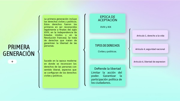 La primera generación incluye los derechos civiles y políticos. Estos derechos fueron los primeros en ser reconocidos legalmente a finales del siglo XVIII, en la Independencia de Estados Unidos y en la Revolución Francesa. Se trata de derechos que tratan de garantizar la libertad de las personas.