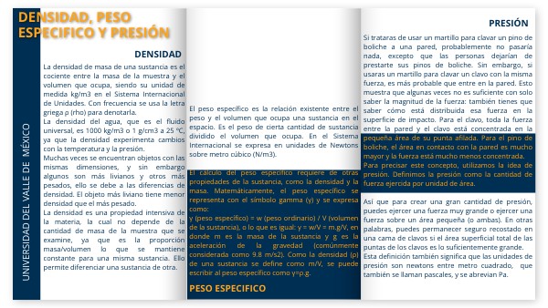 La densidad de masa de una sustancia es el cociente entre la masa de la muestra y el volumen que ocupa, siendo su unidad de medida kg/m3 en el Sistema Internacional de Unidades. Con frecuencia se usa la letra griega ρ (rho) para denotarla. La densidad del agua, que es el fluido universal, es 1000 kg/m3 o 1 g/cm3 a 25 ºC, ya que la densidad experimenta cambios con la temperatura y la presión. Muchas veces se encuentran objetos con las mismas dimensiones, y sin embargo algunos son más livianos y otros más pesados, ello se debe a las diferencias de densidad. El objeto más liviano tiene menor densidad que el más pesado. La densidad es una propiedad intensiva de la materia, la cual no depende de la cantidad de masa de la muestra que se examine, ya que es la proporción masa/volumen lo que se mantiene constante para una misma sustancia. Ello permite diferenciar una sustancia de otra.
