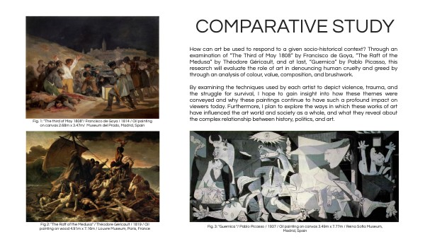 How can art be used to respond to a given socio-historical context? Through an examination of “The Third of May 1808” by Francisco de Goya, “The Raft of the Medusa” by Théodore Géricault, and at last, “Guernica” by Pablo Picasso, this research will evaluate the role of art in denouncing human cruelty and greed by through an analysis of colour, value, composition, and brushwork. By examining the techniques used by each artist to depict violence, trauma, and the struggle for survival, I hope to gain insight into how these themes were conveyed and why these paintings continue to have such a profound impact on viewers today. Furthermore, I plan to explore the ways in which these works of art have influenced the art world and society as a whole, and what they reveal about the complex relationship between history, politics, and art.