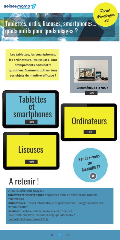 Un outil, différents usages : Tablettes et smartphones : Appareils mobiles dotés d'applications multimédias Ordinateurs : Travail informatique et professionnel, navigation internet, communication Liseuses : Lecture mobile de livres électroniques Pour toute question, contactez l'équipe Medialib77 : medialib77@departement77.fr
