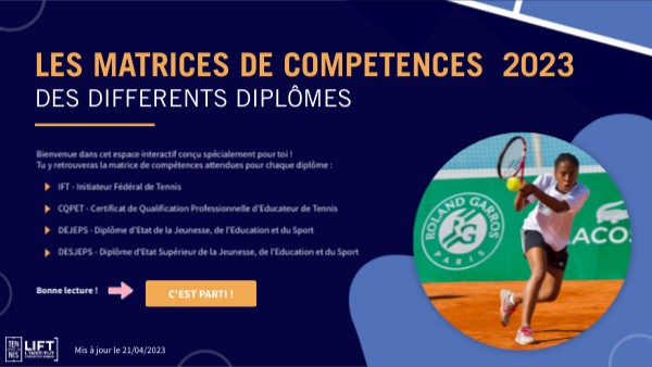 Bienvenue dans cet espace interactif conçu spécialement pour toi !Tu y retrouveras la matrice de compétences attendues pour chaque diplôme : IFT - Initiateur Fédéral de TennisCQPET - Certificat de Qualification Professionnelle d'Educateur de TennisDEJEPS - Diplôme d'Etat de la Jeunesse, de l'Education et du SportDESJEPS - Diplôme d'Etat Supérieur de la Jeunesse, de l'Education et du Sport