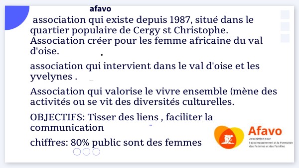 association qui existe depuis 1987, situé dans le quartier populaire de Cergy st Christophe.Association créer pour les femme africaine du val d'oise.association qui intervient dans le val d'oise et les yvelynes . Association qui valorise le vivre ensemble (mène des activités ou se vit des diversités culturelles. OBJECTIFS: Tisser des liens , faciliter la communication chiffres: 80% public sont des femmes