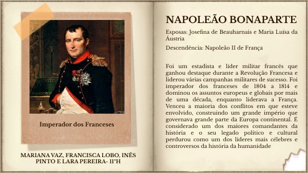 Esposas: Josefina de Beauharnais e Maria Luísa da ÁustriaDescendência: Napoleão II de França Foi um estadista e líder militar francês que ganhou destaque durante a Revolução Francesa e liderou várias campanhas militares de sucesso. Foi imperador dos franceses de 1804 a 1814 e dominou os assuntos europeus e globais por mais de uma década, enquanto liderava a França. Venceu a maioria dos conflitos em que esteve envolvido, construindo um grande império que governava grande parte da Europa continental. É considerado um dos maiores comandantes da história e o seu legado político e cultural perdurou como um dos líderes mais célebres e controversos da história da humanidade