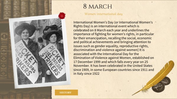 International Women's Day (or International Women's Rights Day) is an international event which is celebrated on 8 March each year and underlines the importance of fighting for women's rights, in particular for their emancipation, recalling the social, economic and political achievements and bringing attention to issues such as gender equality, reproductive rights, discrimination and violence against women] It is associated with the International Day for the Elimination of Violence against Women, established on 17 December 1999 and which falls every year on 25 November. It has been celebrated in the United States since 1909, in some European countries since 1911 and in Italy since 1922