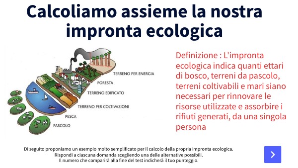 Di seguito proponiamo un esempio molto semplificato per il calcolo della propria impronta ecologica.Rispondi a ciascuna domanda scegliendo una delle alternative possibili.Il numero che comparirà alla fine del test indicherà il tuo punteggio.
