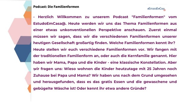 - Herzlich Willkommen zu unserem Podcast "Familienformen" vom EstudoEmCasa@. Heute werden wir uns das Thema Familienformen aus einer etwas unkonventionellen Perspektive anschauen. Zuerst einmal müssen wir sagen, dass wir die verschiedenen Familienformen unserer heutigen Gesellschaft großartig finden. Welche Familienformen kennt ihr?
