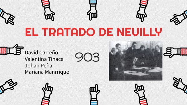 Puntos importantes del Tratado de Neuilly Tratado de Neuilly Protestas contra el Tratado de Neuilly, 1929 El tratado que se propuso a los búlgaros fue muy similar al que se le ofreció a los alemanes. Como consecuencia de esto, muchas de las sanciones no podían ser cumplidas por Bulgaria (un país mucho menos poderoso económicamente) o simplemente no aplicaban. Según los términos del tratado, Bulgaria debió entregar una parte de su territorio a Grecia, lo que le costó su acceso directo al mar Egeo, el cual habían ganado en la Guerra de los Balcanes en 1913. La nación yugoslava, que estaba recientemente formada, también recibió parte del territorio búlgaro, según indicaba el tratado. Pagos A Bulgaria se le obligó a pagar 2250 millones de francos de oro, además de tener que enviar ganado y carbón como pago a los países afectados en la guerra. Esto llevó a la implementación de un comité internacional en Bulgaria para supervisar los pagos. Además, se obligó a Bulgaria a pagar por la estadía de este comité. Desmilitarización Tal como ocurrió con Alemania, se obligó a Bulgaria a reducir su poderío militar significativamente como castigo por participar en la guerra. Su ejército fue reducido a 20 000 tropas, su policía militar a 10 000 y su patrulla fronteriza a solo 3000. Además, el movimiento militar civil tuvo que ser remplazado por un ejército profesional. Muchos de los integrantes pasaron a formar parte de movimientos políticos que alteraron el rumbo de la política búlgara. Los barcos y aviones militares se repartieron entre las naciones de la Entente (la alianza que ganó la guerra). Aquellos artefactos que no tenían uso para estas naciones fueron destruidos.