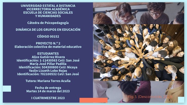 UNIVERSIDAD ESTATAL A DISTANCIA VICERRECTORIA ACADÉMICA ESCUELA DE CIENCIAS SOCIALES Y HUMANIDADES Cátedra de Psicopedagogía DINÁMICA DE LOS GRUPOS EN EDUCACIÓN CÓDIGO 00152 PROYECTO N.º 2 Elaboración colectiva de material educativo ESTUDIANTES Alice Gutiérrez Rivera Identificación: 1-11430563 CeU: San José María José Piñar Padilla Identificación: 504300800 CeU: Nicoya Yaslin Lizzeth Lobo Rojas Identificación: 702100532 CeU: San José Tutora: Mariana Torres Acuña Fecha de entrega Martes 14 de marzo del 2023 I CUATRIMESTRE 2023