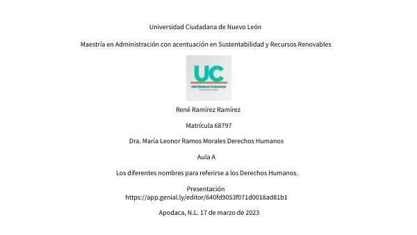 Dra. María Leonor Ramos Morales Derechos Humanos Aula A Los diferentes nombres para referirse a los Derechos Humanos. Presentación https://app.genial.ly/editor/640fd9053f071d0018ad81b1