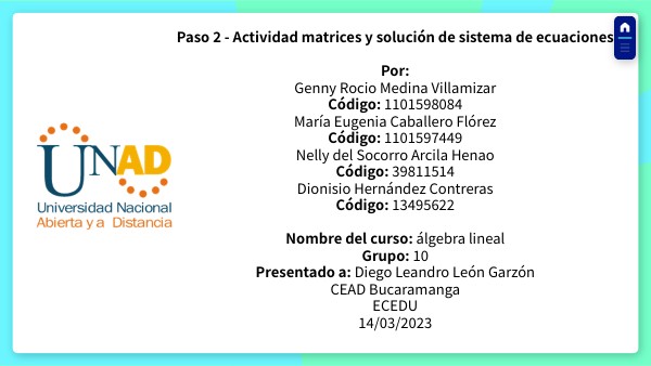 Paso 2 - Actividad matrices y solución de sistema de ecuaciones Por: Genny Rocio Medina Villamizar Código: 1101598084 María Eugenia Caballero Flórez Código: 1101597449 Nelly del Socorro Arcila Henao Código: 39811514 Dionisio Hernández Contreras Código: 13495622 Nombre del curso: álgebra lineal Grupo: 10 Presentado a: Diego Leandro León Garzón CEAD Bucaramanga ECEDU 14/03/2023
