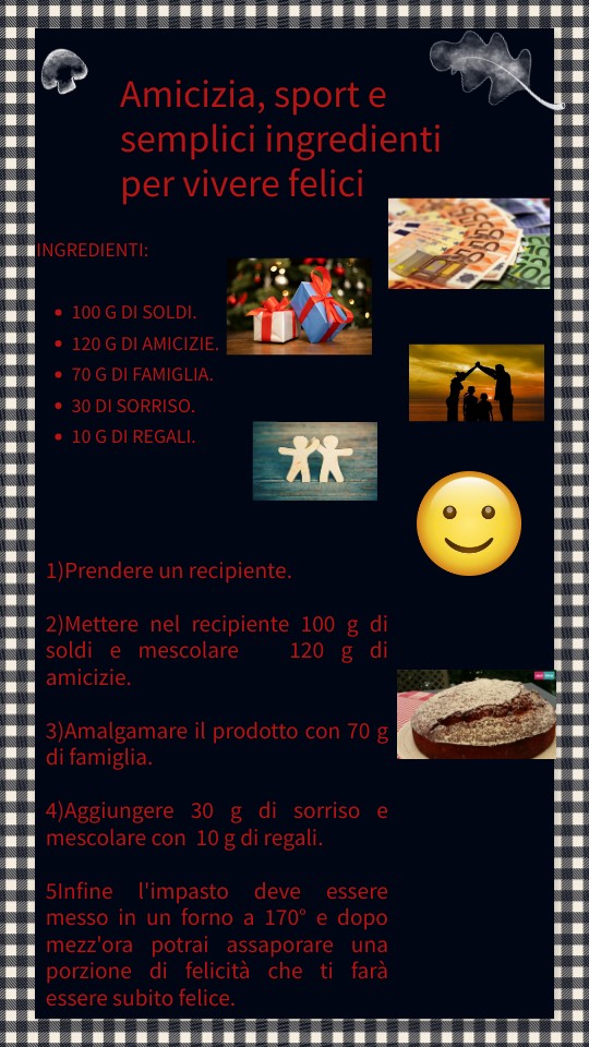 1)Prendere un recipiente.2)Mettere nel recipiente 100 g di soldi e mescolare 120 g di amicizie. 3)Amalgamare il prodotto con 70 g di famiglia. 4)Aggiungere 30 g di sorriso e mescolare con 10 g di regali. 5Infine l'impasto deve essere messo in un forno a 170° e dopo mezz'ora potrai assaporare una porzione di felicità che ti farà essere subito felice.
