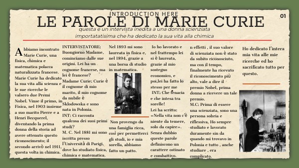 INTERVISTATORE: Buongiorno Madame, cominciamo dalle sue origini. Lei ha un cognome francese, ma lei è francese? Madame Curie: Curie è il cognome di mio marito, il mio cognome da nubile è Sklodowska e sono nata in Polonia. INT: Ci racconta qualcosa dei suoi primi studi? M. C. Nel 1881 mi sono iscritta presso l’Università di Parigi, dove ho studiato fisica, chimica e matematica.