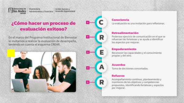 En el marco del Programa Institucional de Bienestar le invitamos a realizar la evaluación de desempeño, teniendo en cuenta el esquema CREAR.