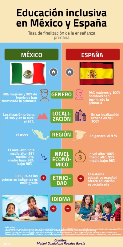 Referencias: Organización de las naciones unidas para la Educación, la Ciencia y la Cultura. (2018). World Inequality Database on Education. Recuperado el 14 de marzo del 2023 de: World Inequality Database on Education - Primary completion rate (education-inequalities.org) Agencia Europea para las necesidades educativas especiales y la inclusión educativa. (2020). Organización del sistema de educación inclusiva. Recuperado el 14 de marzo del 2023 de: España | Agencia Europea para las Necesidades Especiales y la Educación Inclusiva (european-agency.org)