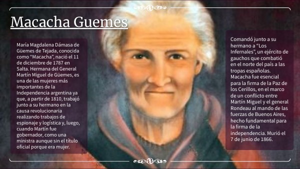 María Magdalena Dámasa de Güemes de Tejada, conocida como “Macacha”, nació el 11 de diciembre de 1787 en Salta. Hermana del General Martín Miguel de Güemes, es una de las mujeres más importantes de la Independencia argentina ya que, a partir de 1810, trabajó junto a su hermano en la causa revolucionaria realizando trabajos de espionaje y logística y, luego, cuando Martín fue gobernador, como una ministra aunque sin el título oficial porque era mujer.