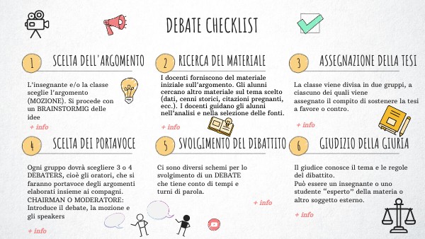 Ci sono diversi schemi per lo svolgimento di un DEBATE che tiene conto di tempi e turni di parola.