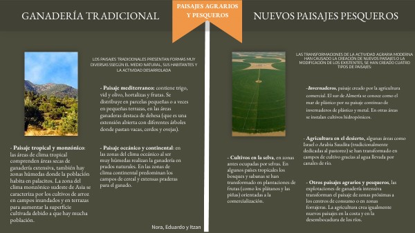 - Otros paisajes agrarios y pesqueros, las explotaciones de ganadería intensiva transforman el paisaje de zonas próximas a los centros de consumo o en zonas forrajeras. La agricultura crea igualmente nuevos paisajes en la costa y en la desembocadura de los ríos.