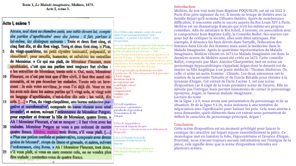 IntroductionMolière, de son vrai nom Jean-Baptiste POQUELIN, est né en 1622 à Paris d'un père tapissier du roi. Il monte sa troupe de théâtre avec la famille Béjart qu'il nomma L'illustre théâtre. Après de nombreuses difficultés, il rencontre enfin le succès auprès du Roi Louis XIV à Paris. Molière est un dramaturge français qui écrit lui-même ses propres comédies. Afin de satisfaire le Roi Soleil, il invente, en association avec le compositeur Jean-Baptiste Lully, la Comédie Ballet. Ses œuvres ont pour but de critiquer la société, elles sont dites satiriques. Par exemple, il dénonce les faux dévots dans Tartuffe, l'éducation des femmes dans L'école des femmes mais aussi la médecine dans le Malade Imaginaire. Après la quatrième représentation du Malade Imaginaire, Molière s'éteint en 1673.Le Malade Imaginaire est donc la dernière œuvre de Molière ayant été créée en 1673. Cette comédie Ballet, composée par Marc Antoine Charpentier, met en scène un personnage hypocondriaque s’appelant Argan dont le dessein est de marier sa fille Angélique à un jeune médecin : Thomas Diafoirus. Or, celle-ci aime un autre homme : Cléante. Les deux amoureux ont le soutien de la servante Toinette et de l’oncle Béralde pour résister à la tyrannie d’Argan. Dans cet extrait de l’Acte 1 scène 5, Argan annonce à sa fille Angélique qu'il veut la marier avec Thomas Diafoirus. Toinette démarre une querelle avec son maître pour défendre Angélique. Au début de la dispute, chacun expose ses idées puis, cela se transforme en violences physiques, insultes et menaces.Lecture du texteDe la ligne 1 à 10, nous avons affaire à la révolte d'Argan. Et de la ligne 11 à 20, nous assistons à la victoire de Toinette sur cette dispute. Cela nous amène à nous demander, comment cette scène de querelle permet d'observer un renversement comique des rôles entre Argan et Toinette ? Conclusion: Cette scène de conflit entre la servante et son maître repose notamment sur le comique de gestes, de mots et de situations. Elle permet un renversement des rôles entre Argan et Toinette. Ce procédé est retrouvé dans les farces. Et le fait d'avoir une relation difficile entre les maîtres et les valets se retrouve souvent dans les comédies.