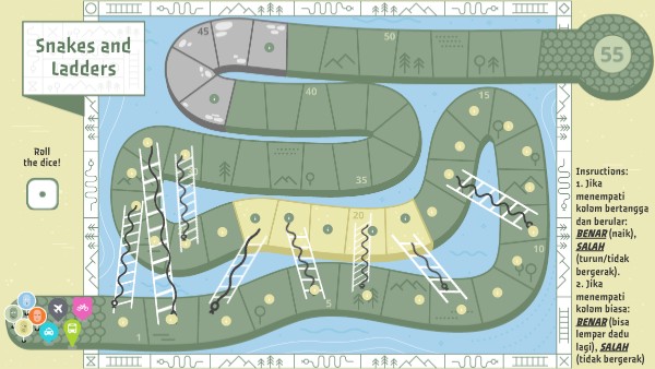 Insructions: 1. Jika menempati kolom bertangga dan berular: BENAR (naik), SALAH (turun/tidak bergerak). 2. Jika menempati kolom biasa: BENAR (bisa lempar dadu lagi), SALAH (tidak bergerak)