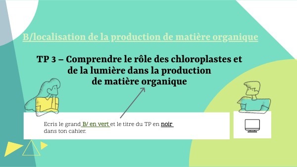 Ecris le grand B/ en vert et le titre du TP en noir dans ton cahier.