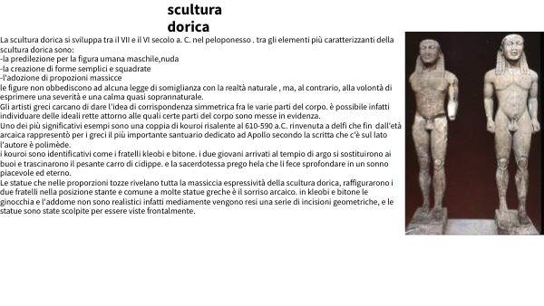 La scultura dorica si sviluppa tra il VII e il VI secolo a. C. nel peloponesso . tra gli elementi più caratterizzanti della scultura dorica sono: -la predilezione per la figura umana maschile,nuda -la creazione di forme semplici e squadrate -l'adozione di propozioni massicce le figure non obbediscono ad alcuna legge di somiglianza con la realtà naturale , ma, al contrario, alla volontà di esprimere una severità e una calma quasi soprannaturale. Gli artisti greci carcano di dare l'idea di corrispondenza simmetrica fra le varie parti del corpo. è possibile infatti individuare delle ideali rette attorno alle quali certe parti del corpo sono messe in evidenza. Uno dei più significativi esempi sono una coppia di kouroi risalente al 610-590 a.C. rinvenuta a delfi che fin dall'età arcaica rappresentò per i greci il più importante santuario dedicato ad Apollo secondo la scritta che c'è sul lato l'autore è polimède. i kouroi sono identificativi come i fratelli kleobi e bitone. i due giovani arrivati al tempio di argo si sostituirono ai buoi e trascinarono il pesante carro di cidippe. e la sacerdotessa prego hela che li fece sprofondare in un sonno piacevole ed eterno. Le statue che nelle proporzioni tozze rivelano tutta la massiccia espressività della scultura dorica, raffigurarono i due fratelli nella posizione stante e comune a molte statue greche è il sorriso arcaico. in kleobi e bitone le ginocchia e l'addome non sono realistici infatti mediamente vengono resi una serie di incisioni geometriche, e le statue sono state scolpite per essere viste frontalmente.
