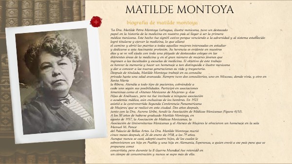 y dar a conocer a las nuevas generaciones su vida y trayectoria. Después de titulada, Matilde Montoya trabajó en su consulta