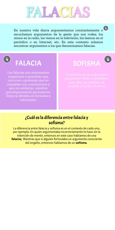 Las falacias son argumentos engañosos o aparentes que recurren a premisas que no respaldan sus conclusiones y que sin embargo, resultan psicológicamente persuasivos. Estas se dividen en formales e informales.