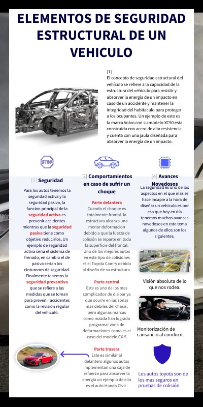 [1]El concepto de seguridad estructural del vehículo se refiere a la capacidad de la estructura del vehículo para resistir y absorver la energía de un impacto en caso de un accidente y mantener la integridad del habitaculo para proteger a los ocupantes. Un ejemplo de esto es la marca Volvo con su modelo XC90 esta construida con acero de alta resistencia y cuenta con una jaula diseñada para absorver la energía de un impacto.