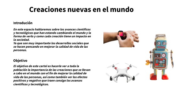 El objetivo de este cartel es hacerle ver a toda la población la importancia de las creaciones que se llevan a cabo en el mundo con el fin de mejorar la calidad de vida de las personas, así como también ver los efectos positivos y negativo que traen consigo los avances cientificos y tecnológicos.