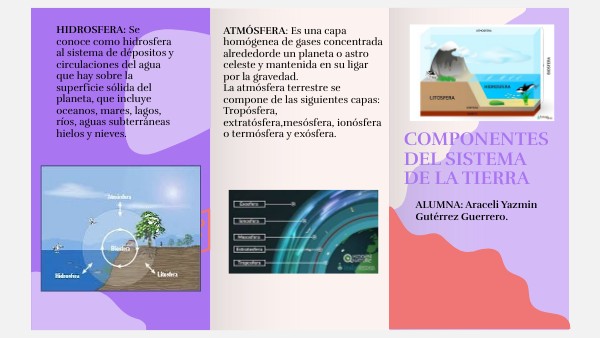El sistema de la Tierra puede ser catalogado en uno de cuatro subsistemas principales (tierra, agua, seres vivos y aire). A estos cuatro subsistemas les llamamos “esferas", las cuales son: la litosfera, la hidrosfera y la atmósfera