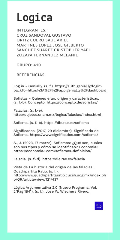 Log in - Genially. (s. f.). https://auth.genial.ly/login?backTo=https%3A%2F%2Fapp.genial.ly%2Fdashboard Sofistas - Quiénes eran, origen y características. (s. f.-b). Concepto. https://concepto.de/sofistas/ Falacias. (s. f.-e). http://objetos.unam.mx/logica/falacias/index.html Sofisma. (s. f.-b). https://dle.rae.es/sofisma Significados. (2017, 29 diciembre). Significado de Sofisma. https://www.significados.com/sofisma/ S., J. (2023, 17 marzo). Sofismos: ¿Qué son, cuáles son sus tipos y cómo se identifican? Economia3. https://economia3.com/sofismos-definicion/ Falacia. (s. f.-d). https://dle.rae.es/falacia Vista de La historia del origen de las falacias | Quadripartita Ratio. (s. f.). http://www.quadripartitaratio.cucsh.udg.mx/index.php/QR/article/view/121/437 Lógica Argumentativa 2.0 (Nuevo Programa, Vol. 2"Pàg 184"). (s. f.). Jose W. Wiechers Rivero.