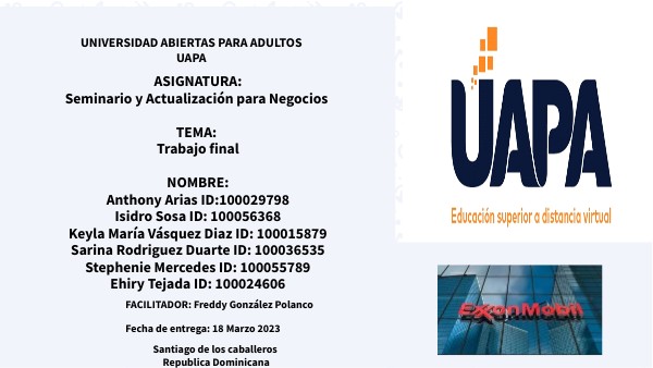 ASIGNATURA:Seminario y Actualización para Negocios TEMA: Trabajo final NOMBRE: Anthony Arias ID:100029798 Isidro Sosa ID: 100056368 Keyla María Vásquez Diaz ID: 100015879 Sarina Rodriguez Duarte ID: 100036535 Stephenie Mercedes ID: 100055789 Ehiry Tejada ID: 100024606