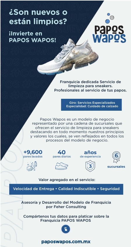 Papos Wapos es un modelo de negocio representado por una cadena de sucursales que ofrecen el servicio de limpieza para sneakers destacando en todo momento nuestros principios y valores los cuales, se ven reflejados en todos los procesos del modelo de negocio.
