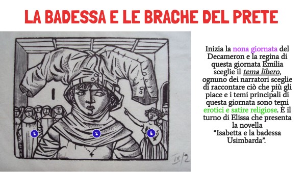 Inizia la nona giornata del Decameron e la regina di questa giornata Emilia sceglie il tema libero, ognuno dei narratori sceglie di raccontare ciò che più gli piace e i temi principali di questa giornata sono temi erotici e satire religiose. È il turno di Elissa che presenta la novella “Isabetta e la badessa Usimbarda”.