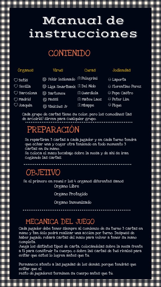 Cada jugador debe tener siempre al comienzo de su turno 3 cartas en mano y tan sólo podrá realizar una acción por turno. Después de haber jugado, robará cartas del mazo para volver a tener su mano completa.Juega los distintos tipos de carta, colocándolas sobre la mesa frente a ti para construir tu cuerpo, o sobre las cartas de tus rivales para evitar que éstos lo logren antes que tú. Permanece atento a las jugadas de los demás, porque tendrás que evitar que el resto de jugadores terminen su cuerpo antes que tú.
